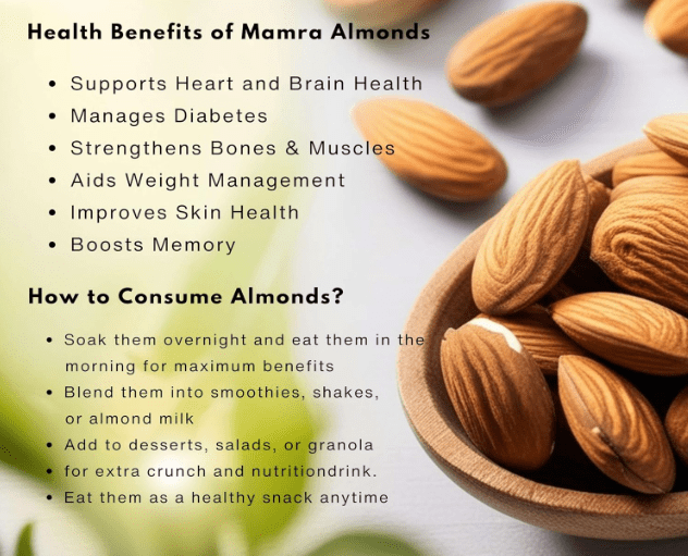 Mamra Badam can be eaten raw, soaked, roasted, or added to smoothies, desserts, cereals, and salads. Soaking them overnight can improve digestibility and enhance nutrient absorption.