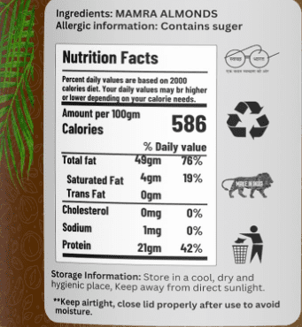 Here’s the nutritional information of LOOJI Original Mamra Badam (per 100g):
